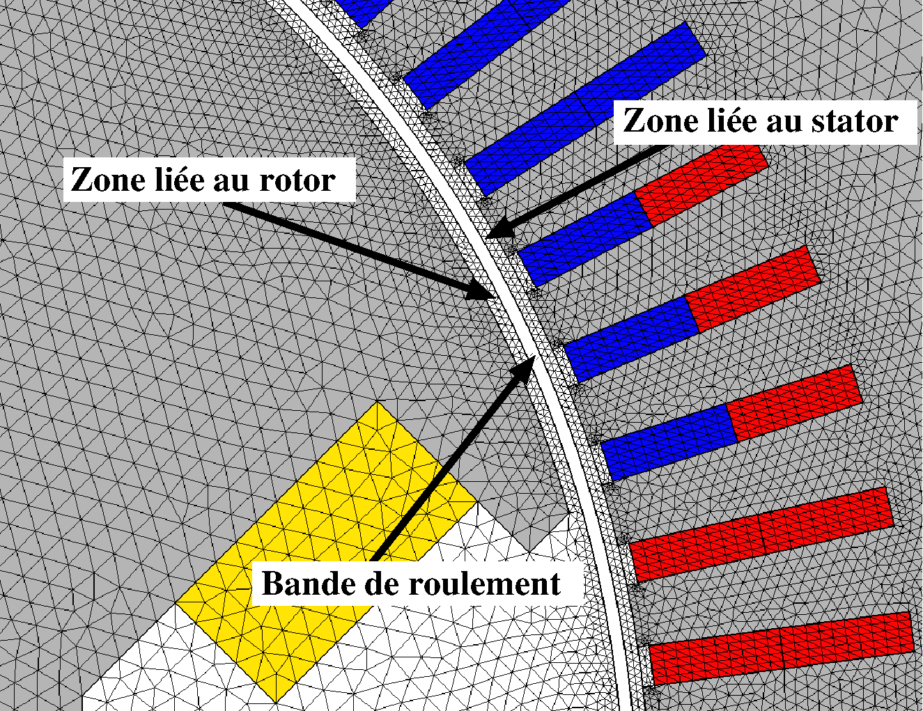 Développée pour les machines électriques rotatives, la technique de la bande de roulement consiste à diviser l’entrefer en 3 zones cylindriques imbriquées (cf Figure ci-dessous) :